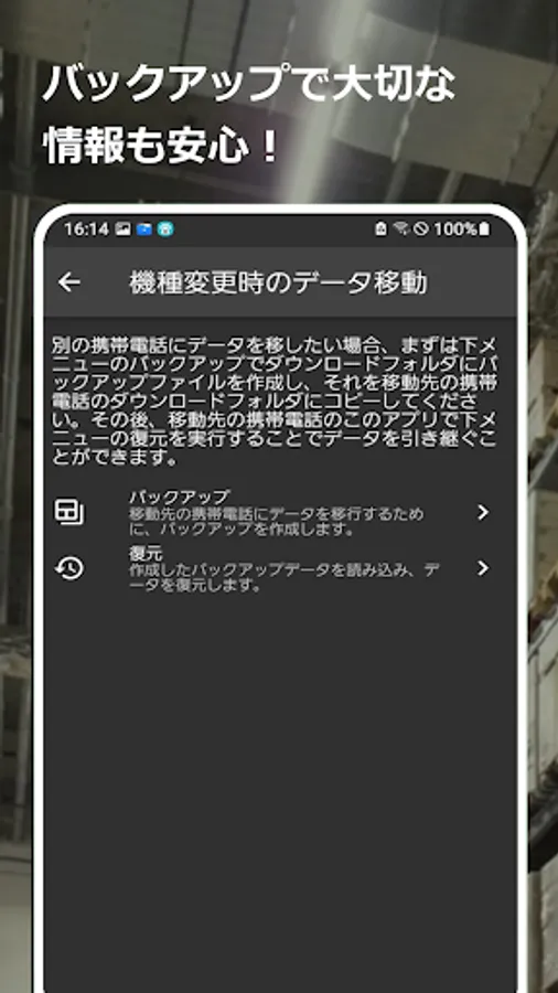 It is equipped with a function to transfer important information including photos to a new mobile phone when changing models. It can also be used as a backup for important information, so you can restore important data even if you need to delete or re-register the app.