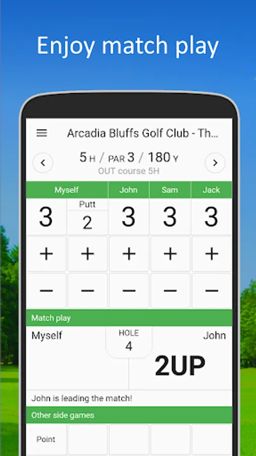 G score offers various side games, including Nearest to the Pin, Driving Contest, Matchplay, Olympic, Bing Bango Bongo, Fairways, and Greens!