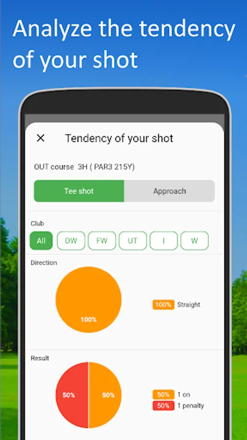 ◇ By adding additional details during score input, such as shot directions and impact, users can use graphs to analyze shot tendencies for tee shots and approaches.