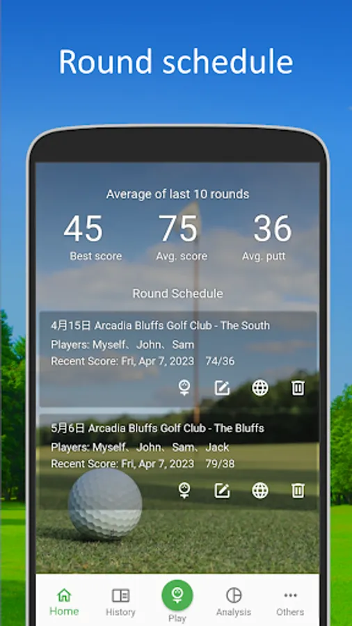 ◇ By inputting planned rounds, users can view golf course names, dates, start times, and members conveniently on the top screen, making it easy to check upcoming rounds. Additionally, simply tapping on a scheduled round initiates the round easily.