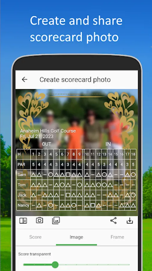 ◇ Users can create commemorative photos by adding score information, golf course names, and more to their favorite pictures. Furthermore, they can upload the created commemorative photos to social media to share them with friends.