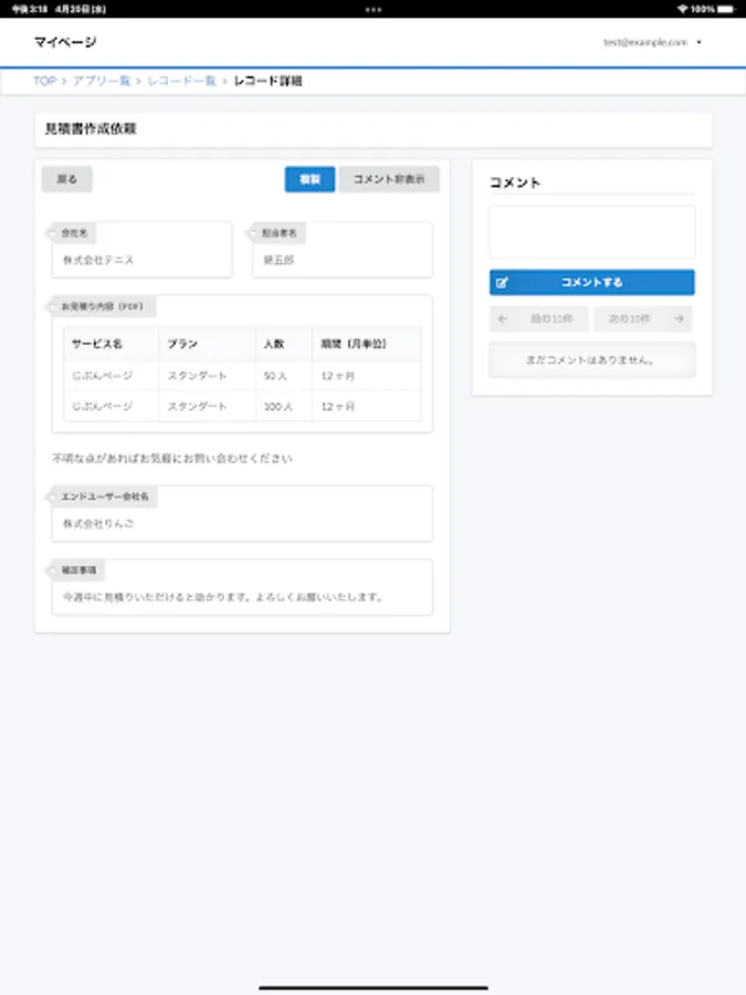 By providing My Page for each customer or business partner, you can share only specific data and view, create, edit, and comment on records.