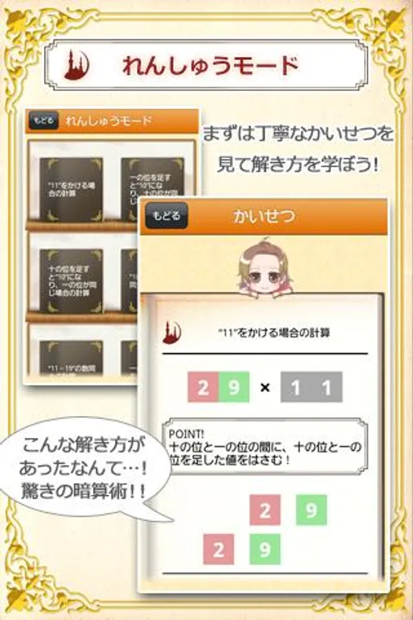 本アプリでは、そのインド式計算を本当の初歩の初歩から学ぶ事ができます。