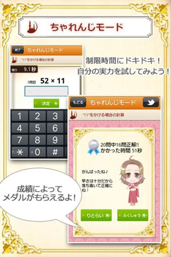 ちゃれんじモードの“計算スピード”と“正確さ”に応じて、金銀銅のメダルが付与されます。是非たくさんちゃれんじして、たくさんメダルを集めてください。