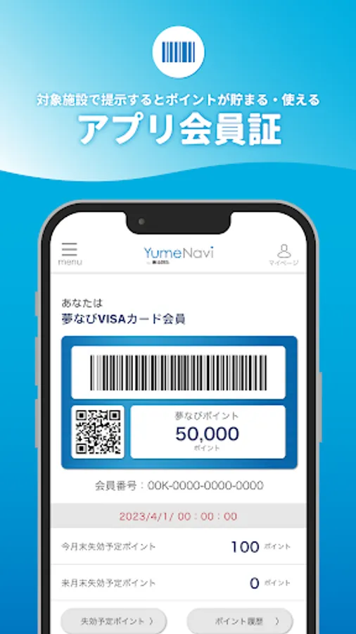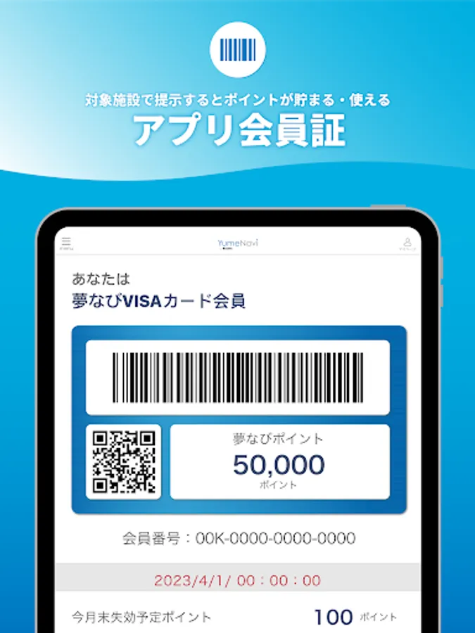 If you use the "YumeNavi Point App", you can earn and use Yumenavi points just by presenting the barcode screen at the target facility of the application membership card!