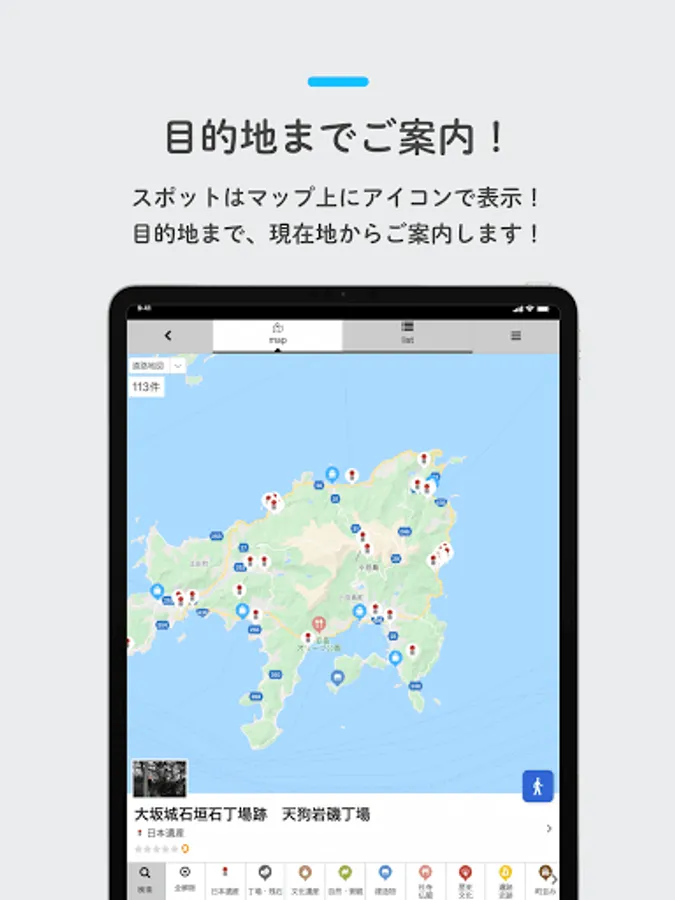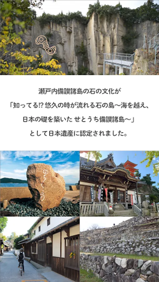 The Setouchi Stone Islands App describes the heritage and cultural assets of the Bisan Islands and introduces the unique stonecutting traditions of the area. There is a wealth of content to familiarize you with the islands, including “Island Love,” a collection of memories by local residents, and “Stone Island Columns” which introduce the attractions on various islands.