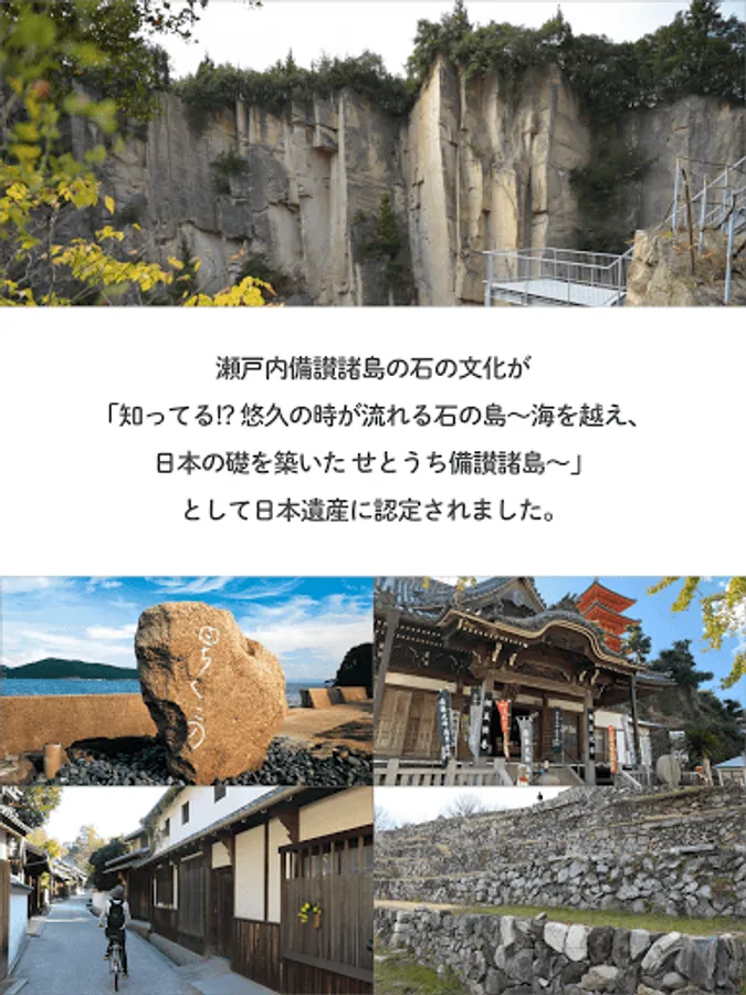 In 2019 the stone culture of the Bisan Islands was recognized as a Japan Heritage site, with the catchphrase, “Do you know? Islands of stone, where time leisurely drifts by. ~The stone of Setouchi Bisan Islands, which laid the foundation of Japan by crossing over the sea.