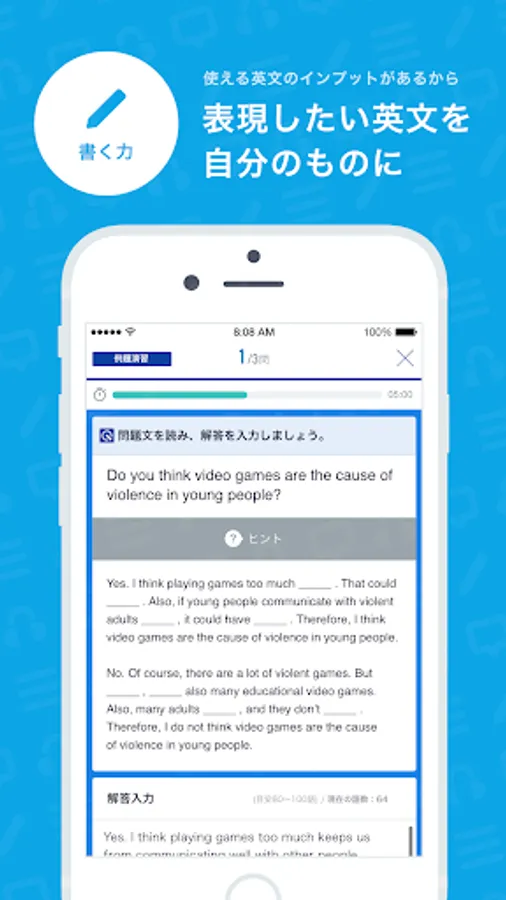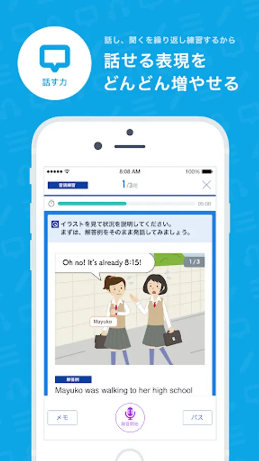 ・講義動画で問題を解く上でのポイントを理解したあと、「キーフレーズ(解答例)の音読」「空所補充」「演習と」いった様に、型を覚えることから段階的にステップを踏みながら発話のトレーニングを行います。英文のインプットとともに、そのインプットした英文を使いながら、自分の言葉でアウトプットする機会を増やしていくことで、最終的に、長い文章を瞬時に発話できる状態が目指せます。