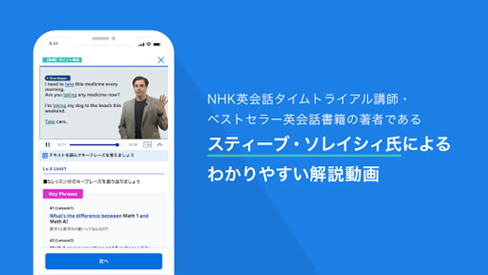 NHKの番組講師もつとめるスティーブ・ソレイシィ氏によるわかりやすい解説動画を通じ、キーフレーズを"学ぶ"から使える"へ導きます。