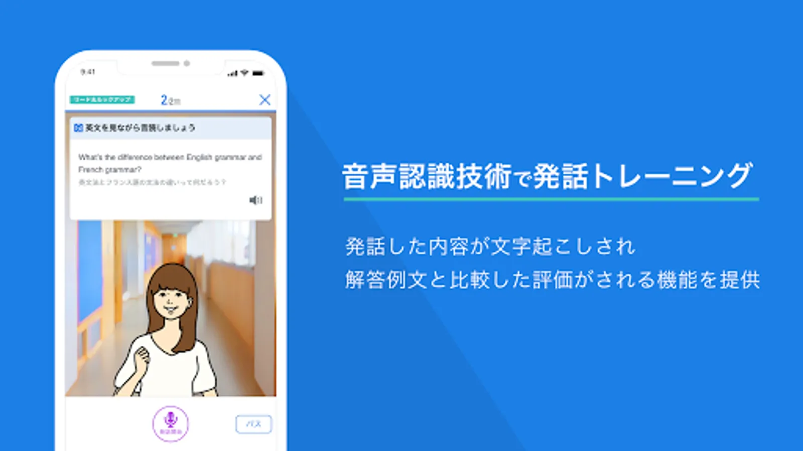 英会話で実際に使える英語表現を音声認識技術を活用して学ぶことができ、スピーキング力の向上やキーフレーズの定着を促します。