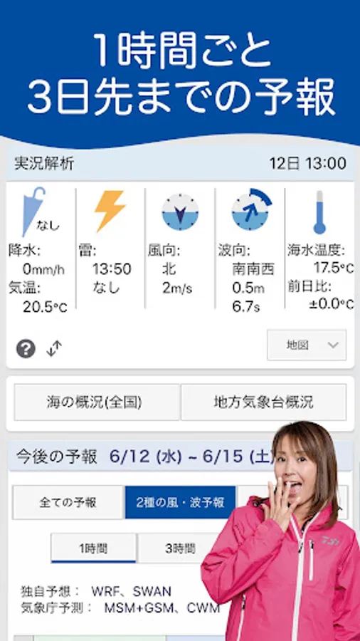 [Free trial function for 1 month] Equipped with "real-time wind forecast" that is updated every hour. We provide marine weather information for a wide variety of marine sports and leisure enthusiasts, including fishing, diving, sailing, sea kayaking and boating.