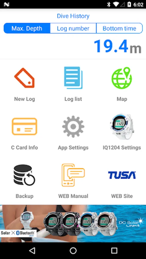 TUSA Diving LOG is a diving logbook app, which enables you to upload log data from TUSA IQ1204 DC Solar Link to your smartphone using Bluetooth® SMART. The TUSA Diving LOG App has many customizable functions to record the details of your dive. Information such as entry time, exit time, dive time, maximum water depth, average water depth, water temperature, air consumption, and much more can be recorded. Customize your dive log by recording dive point locations using maps, add photos, and capture signatures from an instructor. In addition, detailed water depth and warning information can be recorded at intervals, and uploaded to your app. Also you can easily export dive log information as images to share on Facebook, Twitter, or other social media. TUSA Diving LOG can be used independently of TUSA IQ1204 DC Solar link to record basic log information.