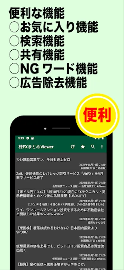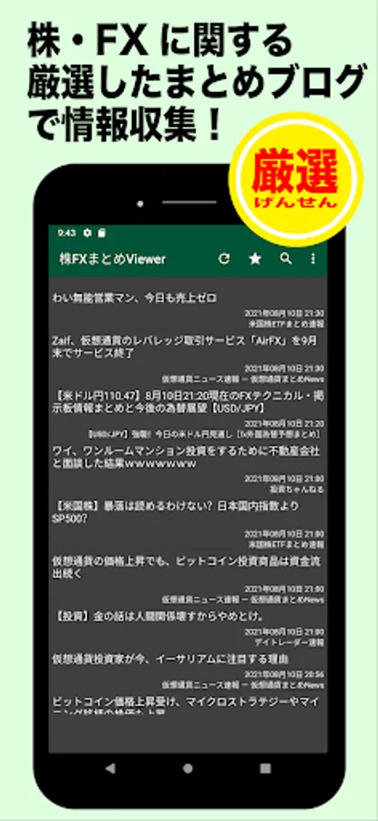 It is a simple viewer that allows you to collect and browse carefully selected 2channel (5channel) stocks, FX, investment, and other summary site articles in an app in real time.