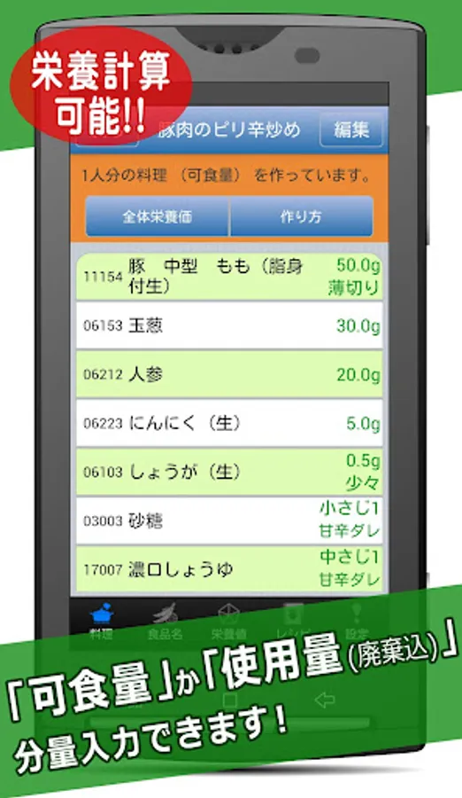 ・可食量か使用量(廃棄込)の分量入力設定が可能
