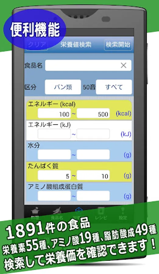 ・栄養素値の範囲を指定して絞り込み検索が可能