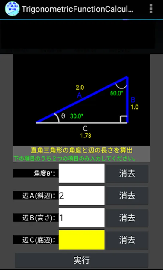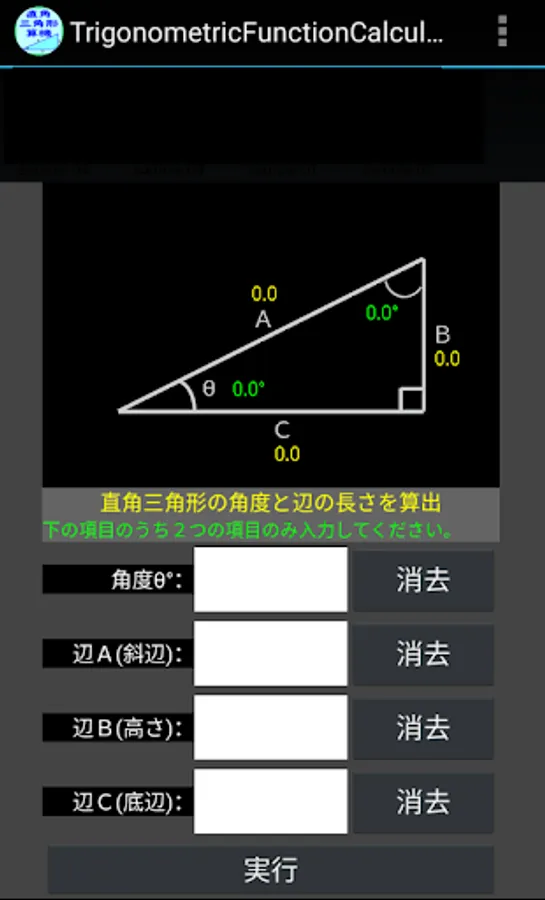 ・After startup, enter two values from the angle θ° and the length of side A, side B, and side C, and touch the execution button to display each side and angle.