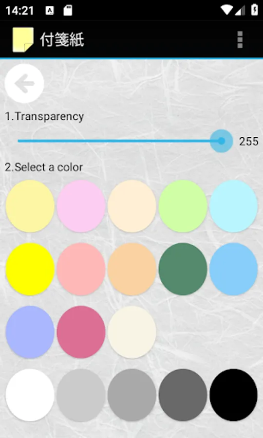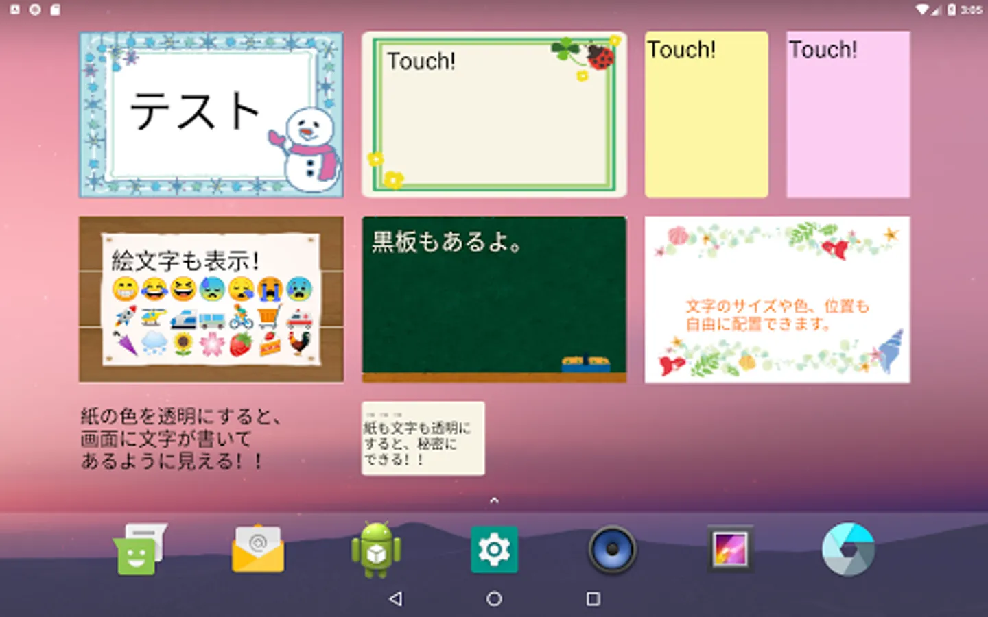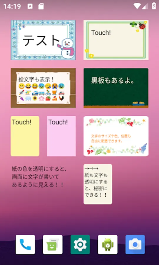 - Freely change sticky note color, text color or text size. (Can also be set to transparent, as if writing directly on the home screen)