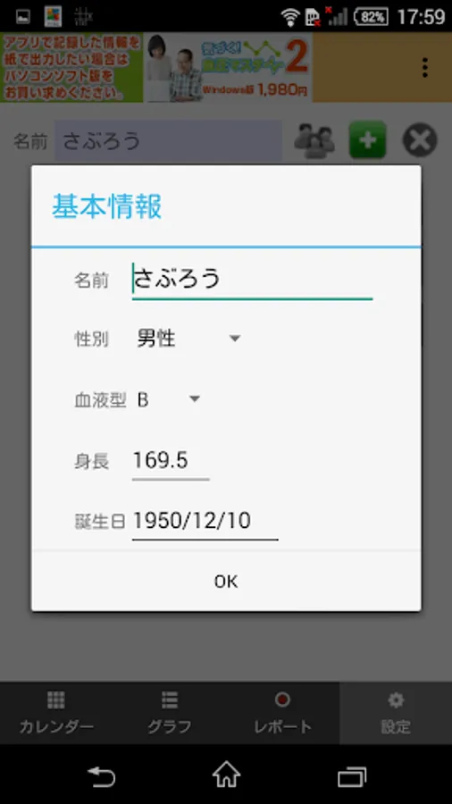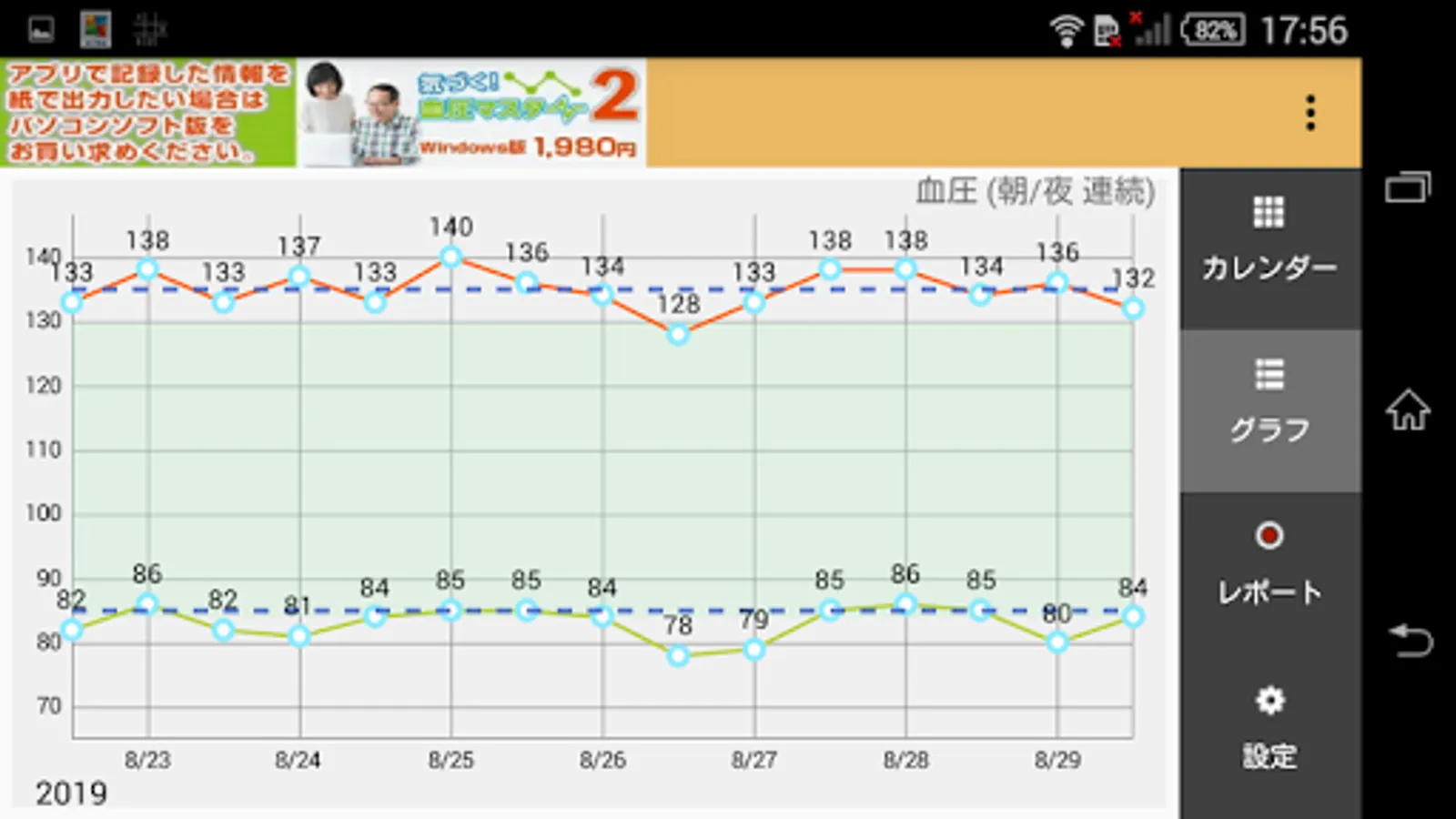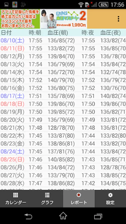 本アプリは、毎日測定する血圧や脈拍・体重を楽しく記録し、それをグラフや一覧表に表示できる無料アプリです。また記録したデータをPC版「気づく!血圧マスター2」に移行してプリンターで出力することもできます(ただしPC版は有料です)。