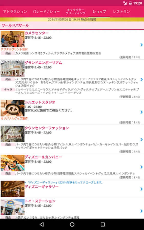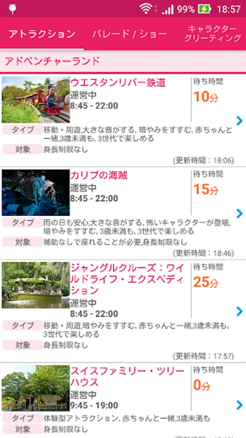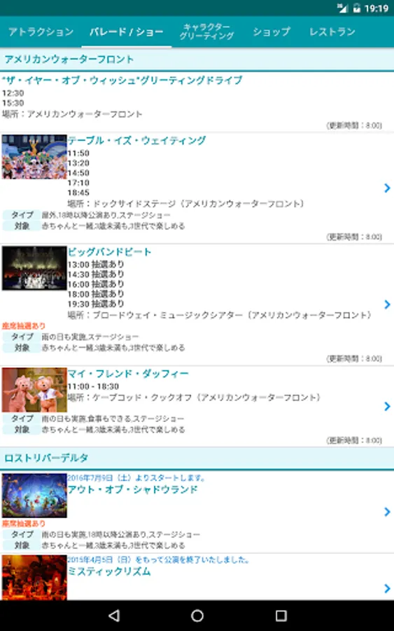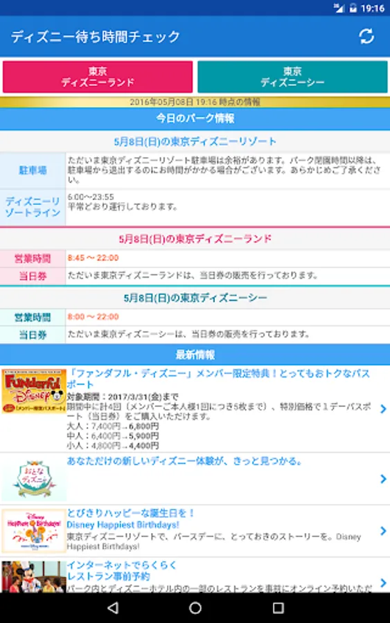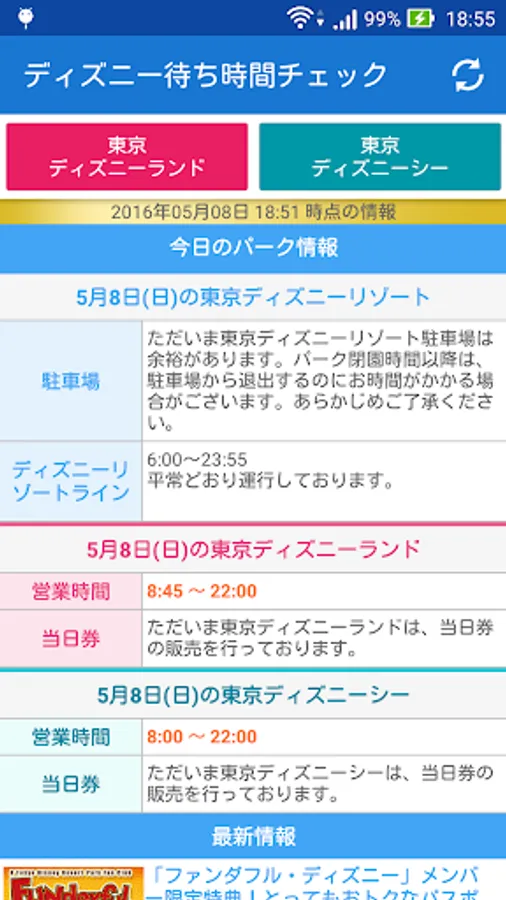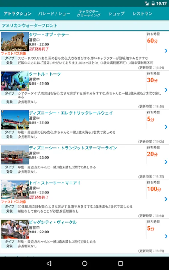 ・ Display of attraction waiting time, operation status, and fastpass ticketing status. Cooperation with the map application.