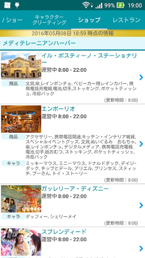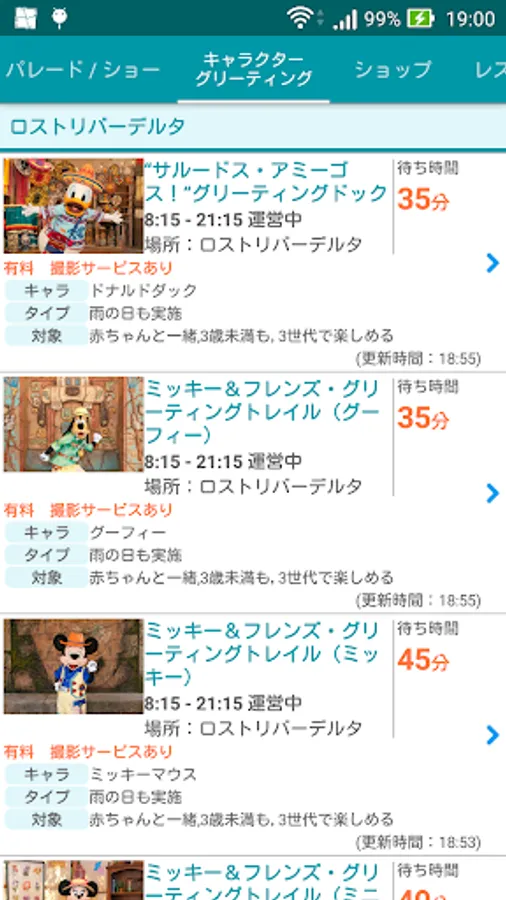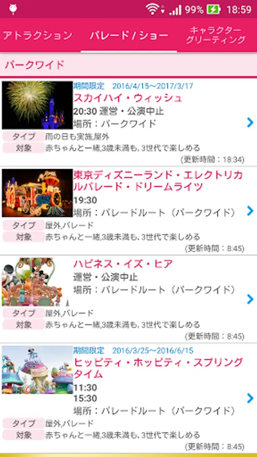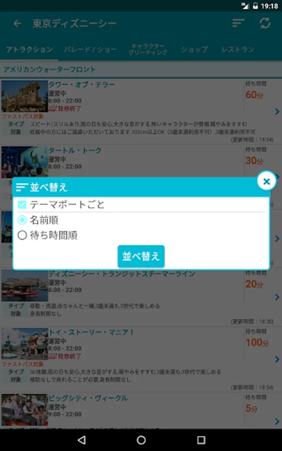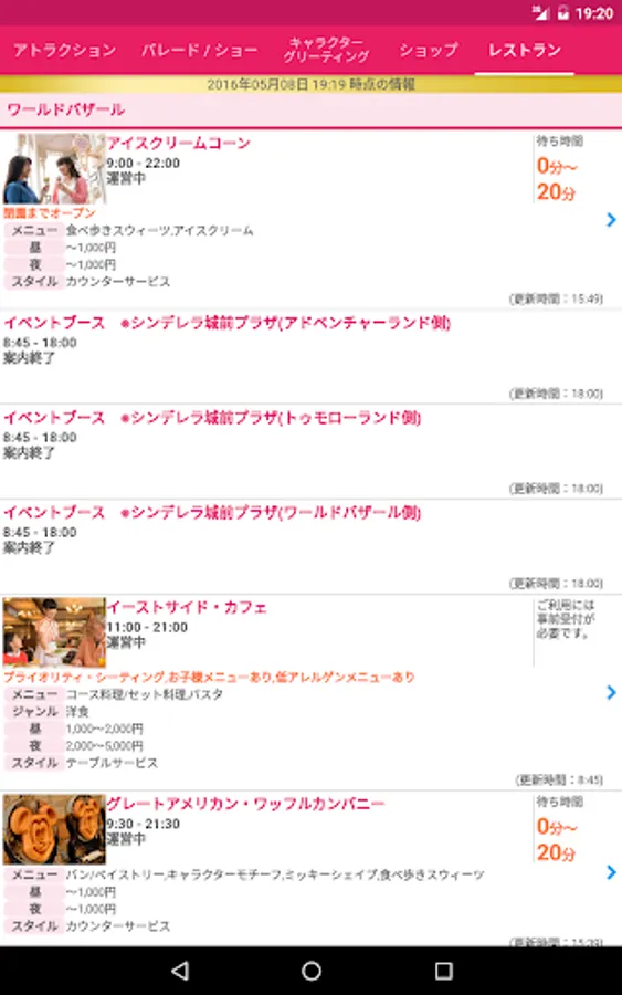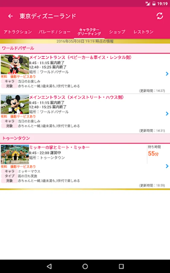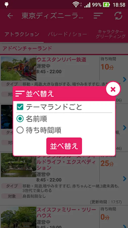 ・ Display of attraction waiting time, operation status, and fastpass ticketing status. Cooperation with the map application.