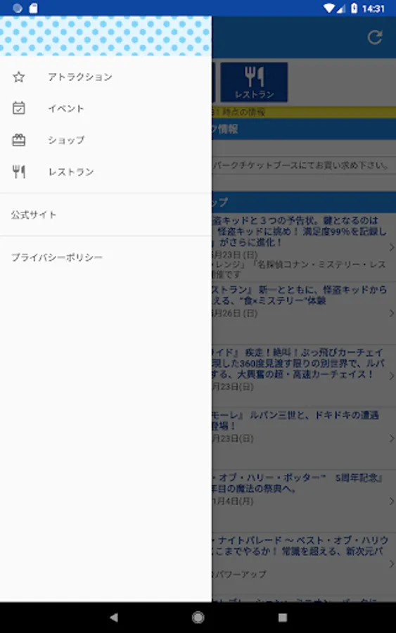 ・ Display of today's park information (parking lot status, opening hours, etc.) and pickup information