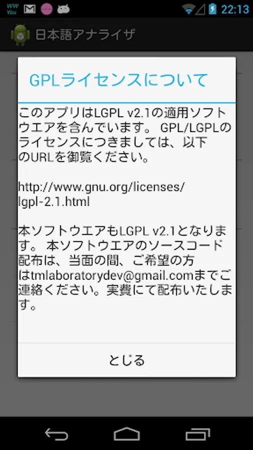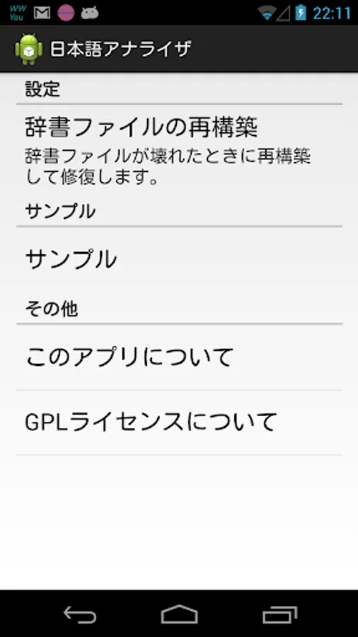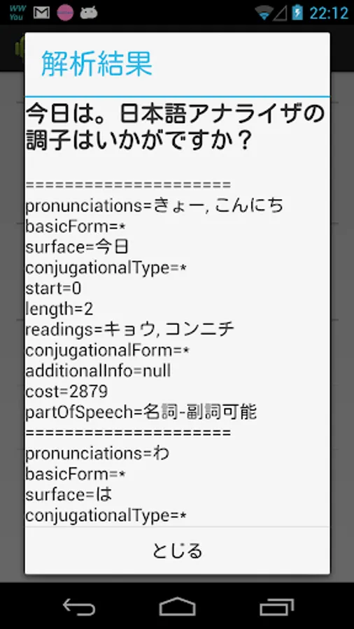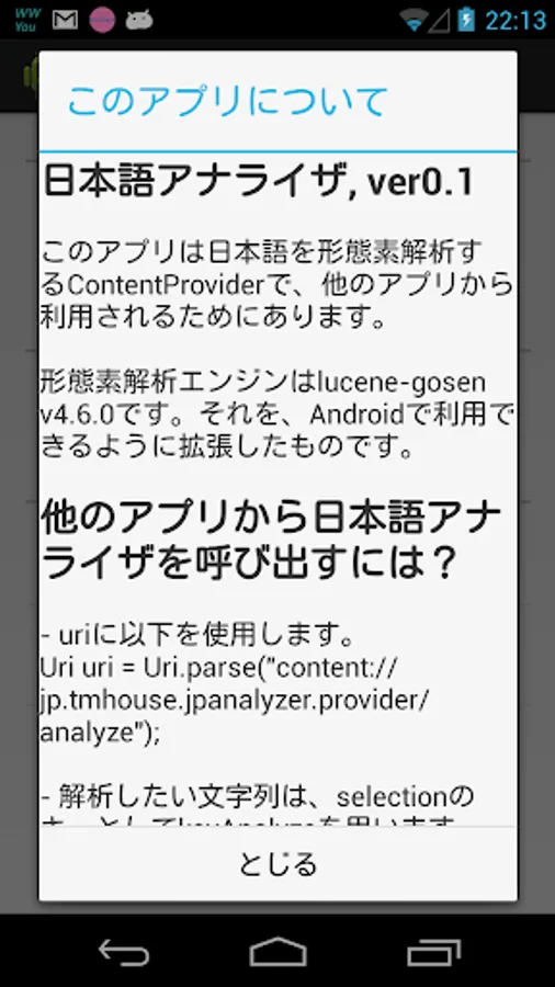 Morphological analysis engine is lucene-gosen v4.6.0. It is an extension to be convenient Android, it.