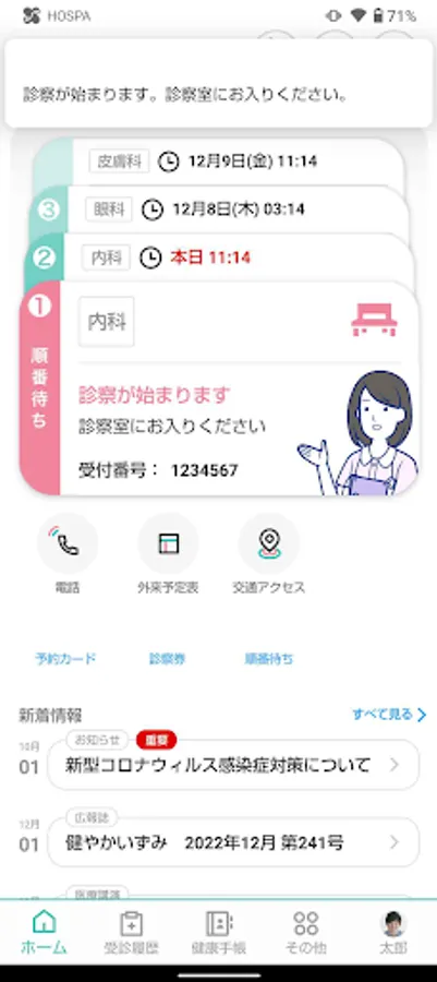 You can spend time outside the waiting room until the examination. When the turn of the medical treatment approaches, you will receive a push notification from the app.