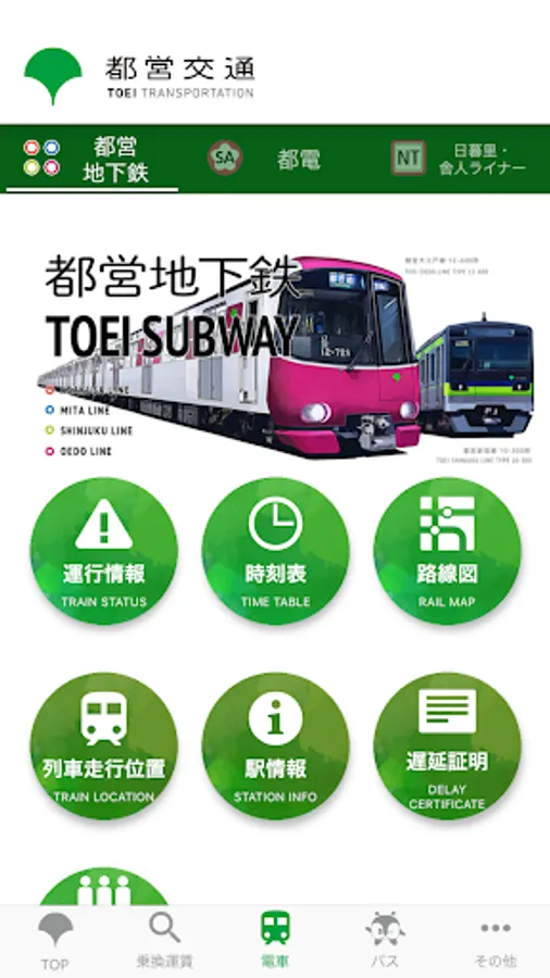 The "Toei Transportation App" service provides useful information, such as real-time running and operation status of each train of the Toei subway and information on the station premises. Furthermore, you can also find information on the Tokyo Sakura Tram (Toden Arakawa Line), Nippori-Toneri Liner and Toei Bus.