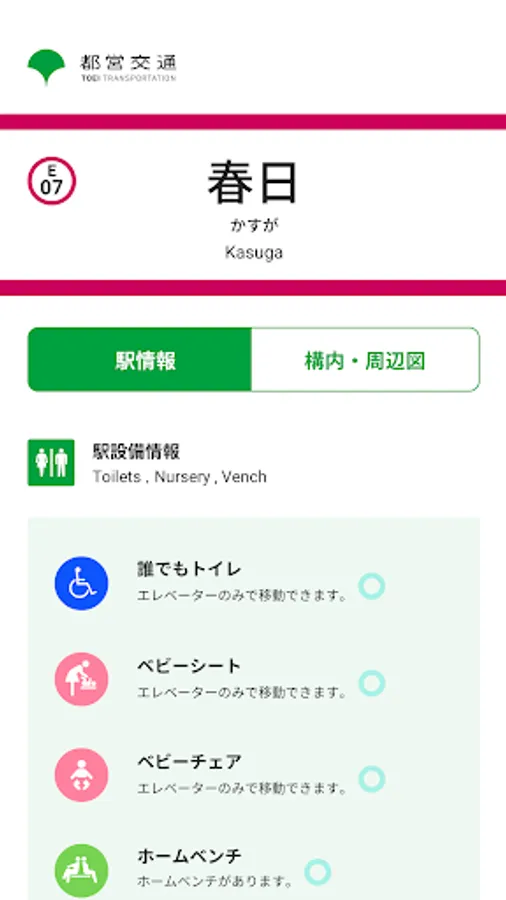 In the case of a delay, the operation information is delivered by push notification to passengers. In addition, you can see useful information when using the Toei subway, such as station map and station area map.