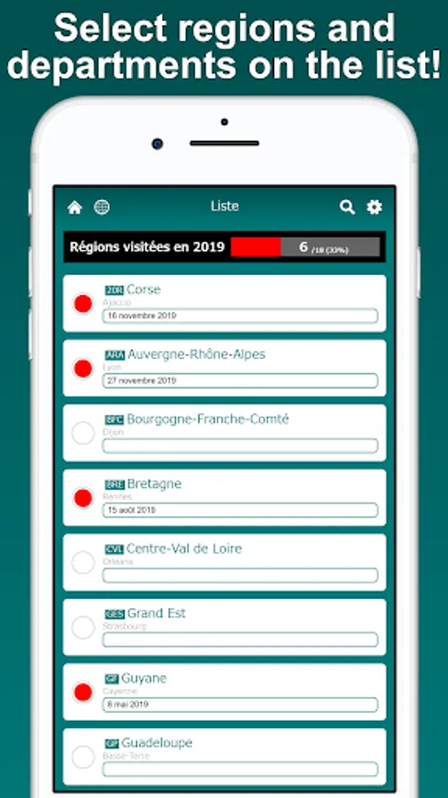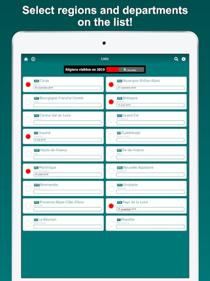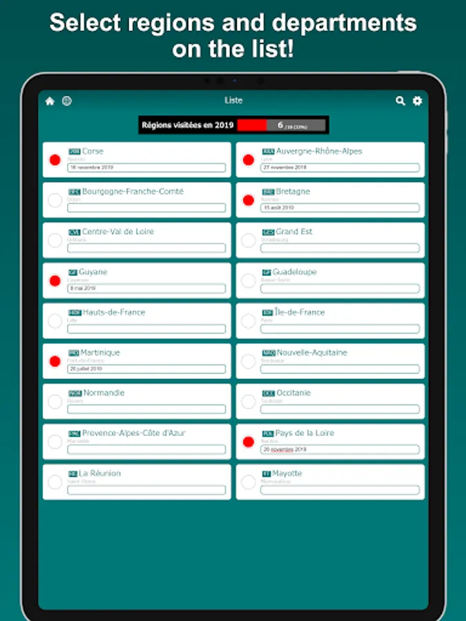 Select the regions and departments you want to mark on the list. In multiple color mode, regions and departments can be painted in different colors for each category. You can save brief notes for each region and department.