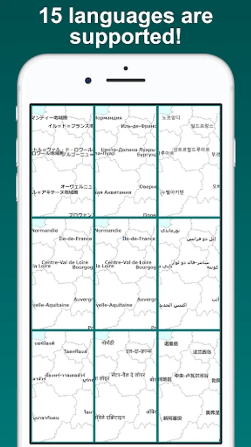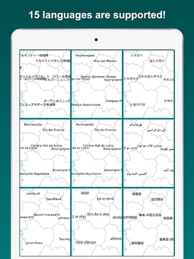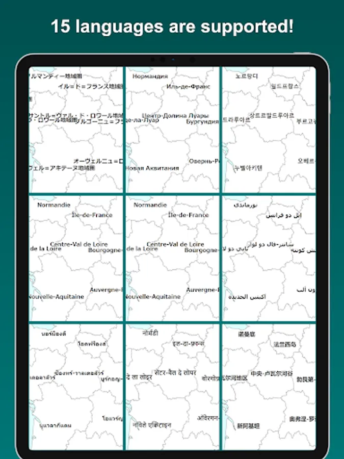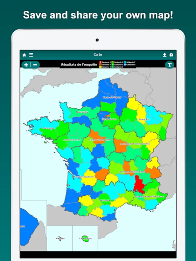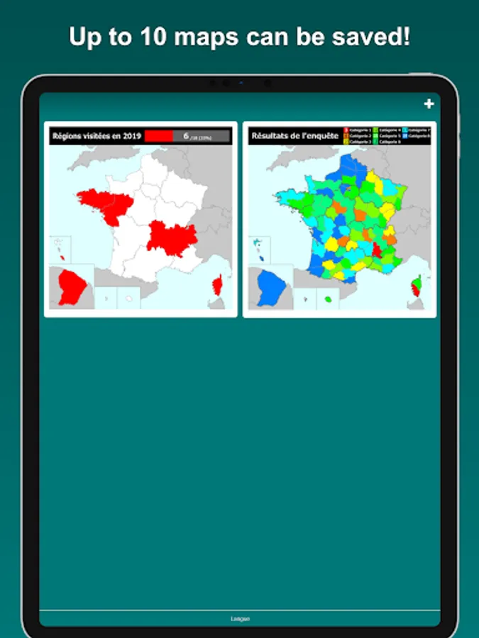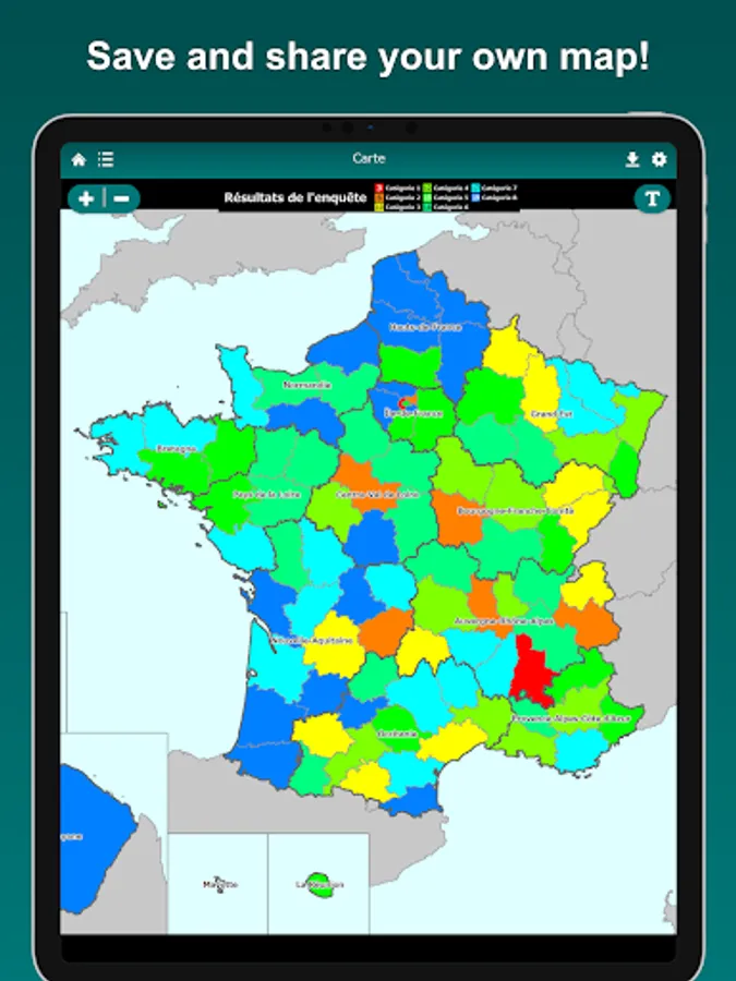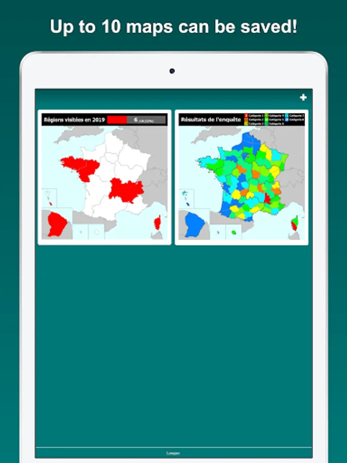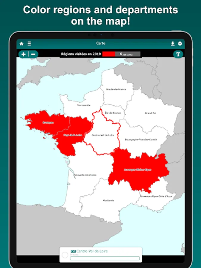 Visualize the regions and departments you have visited on the France map. Tapping a region or a department on the map, you can edit its color and note. By displaying the labels, you can easily locate regions and departments on the map. The map can be zoomed in and out.