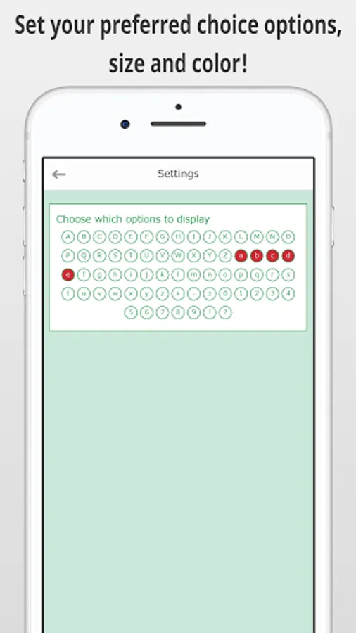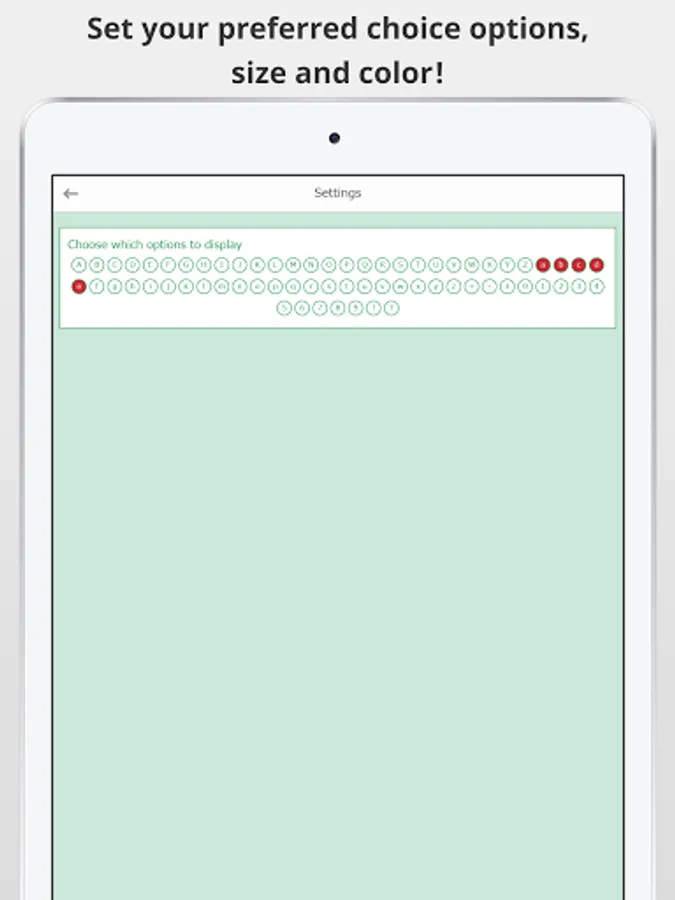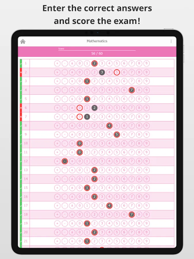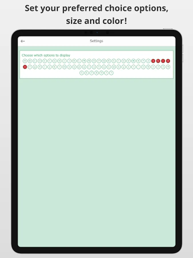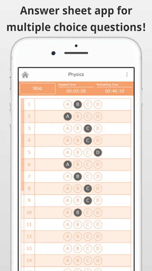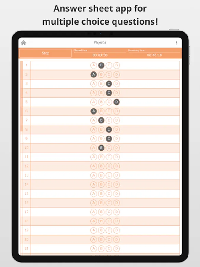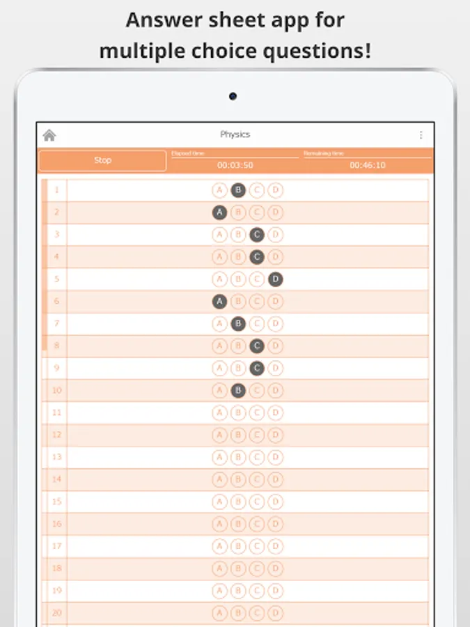 This app recreates the bubble sheet (scantron sheet, mark sheet, multiple-choice answer sheet) on your smartphone or tablet to help you practice for multiple choice exams.