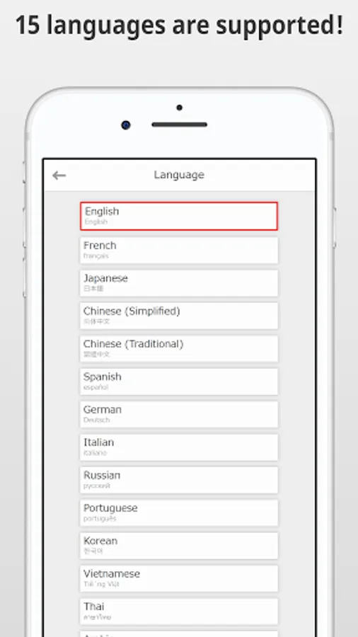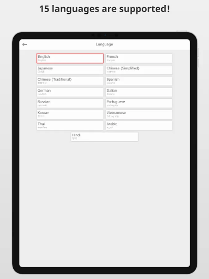 This app supports 15 languages: English, French, Simplified Chinese, Traditional Chinese, Spanish, German, Russian, Portuguese, Italian, Japanese, Korean, Arabic, Hindi, Thai and Vietnamese.