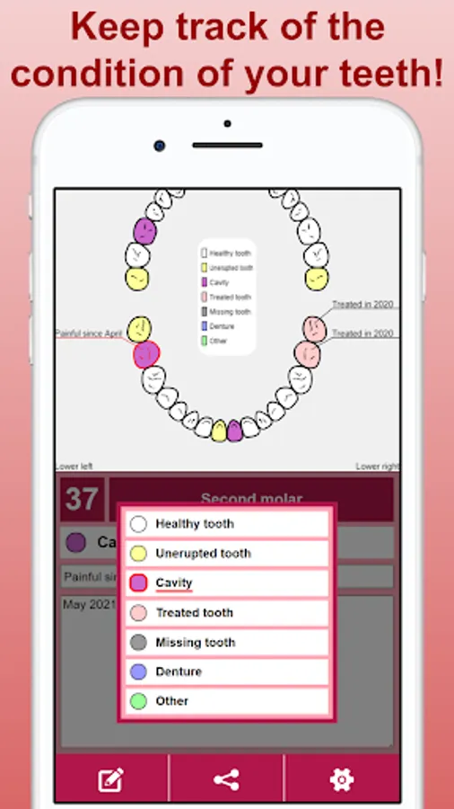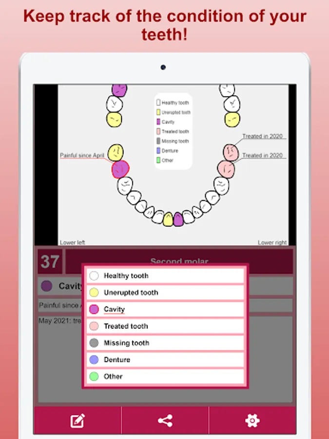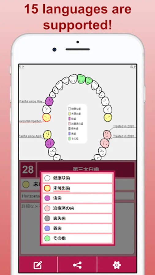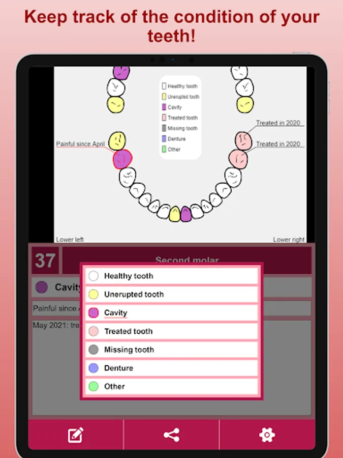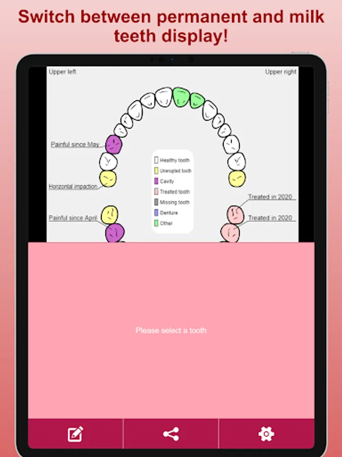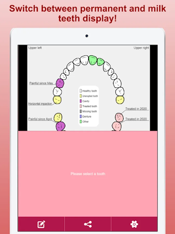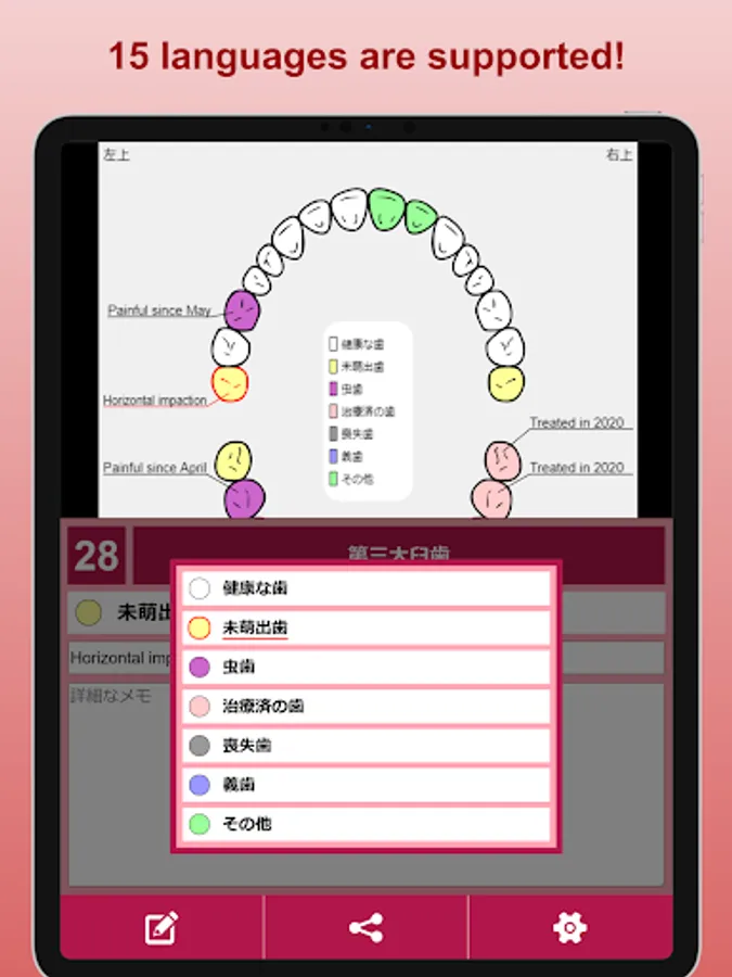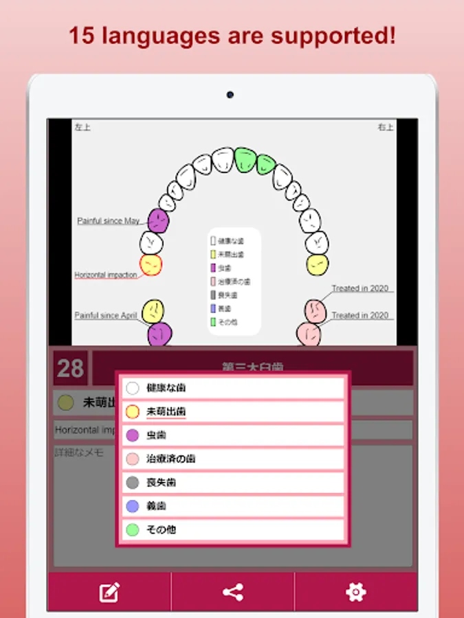 You can select and save the condition of each tooth, such as "healthy tooth," "cavity," "denture," etc. The tooth condition is indicated by color-coding on the screen.