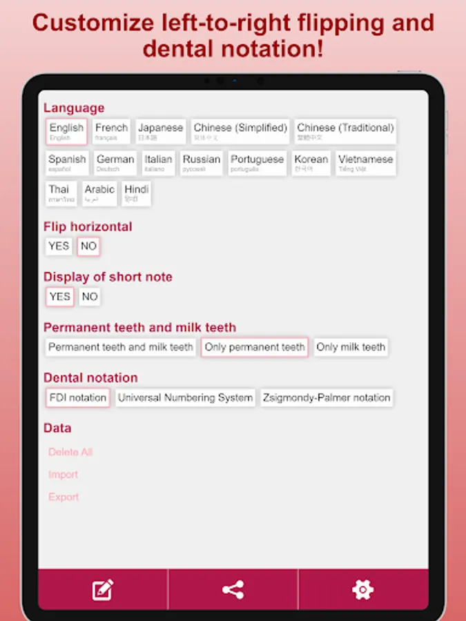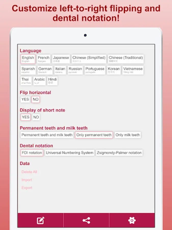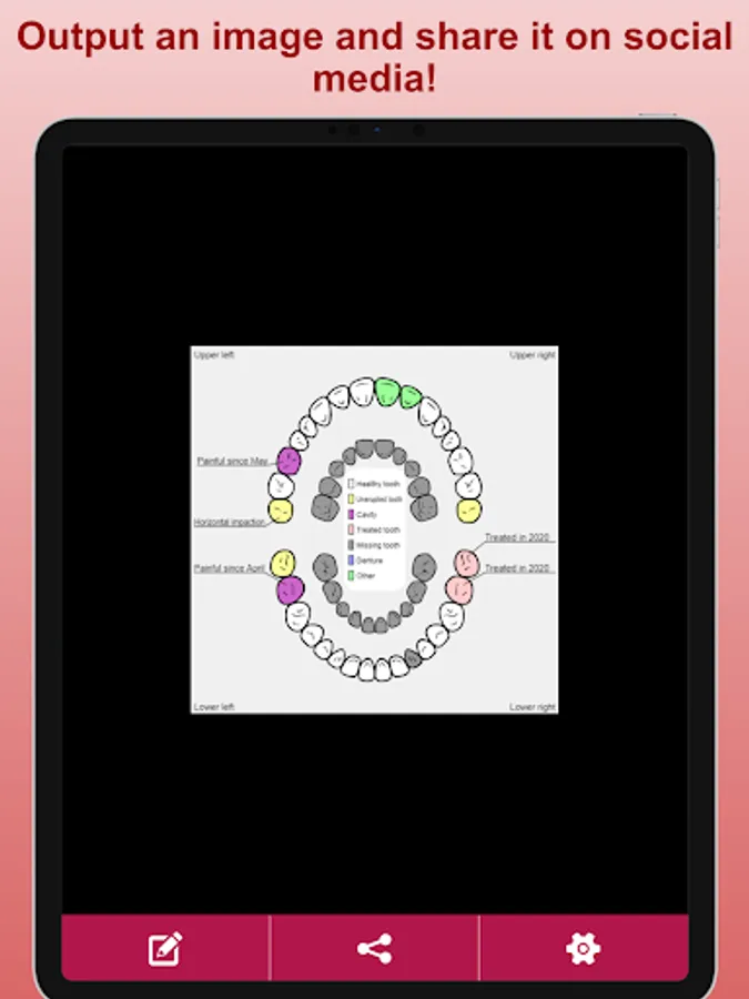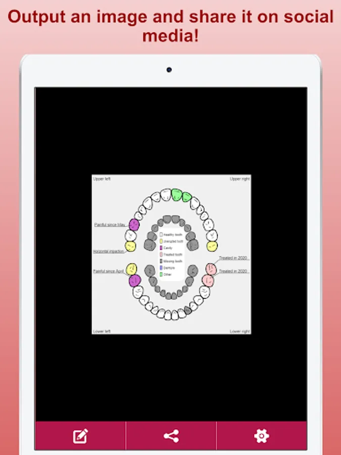 The condition and notes of the teeth can be saved as an image in the device and shared through various social media, such as Instagram, Twitter, Facebook and LINE.