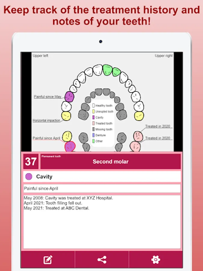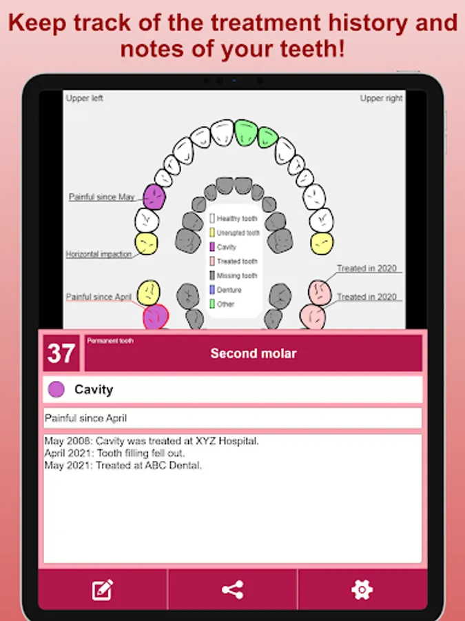 For each tooth, you can edit and save text. You can keep track of various information such as the history of dental treatment, detailed condition, and dates when the teeth grew or fell out of the teeth.