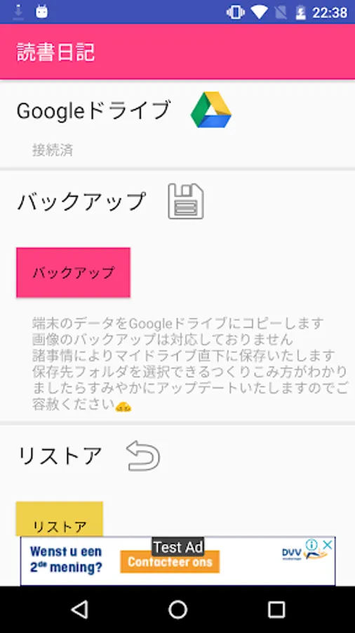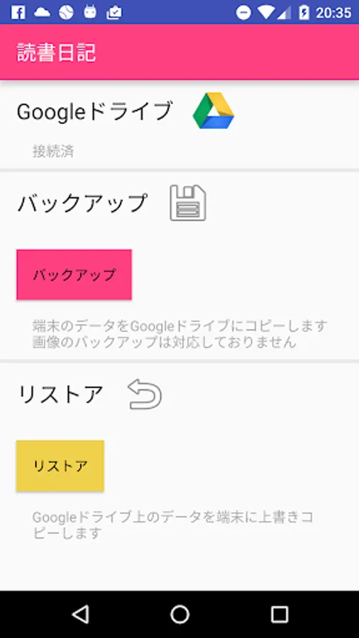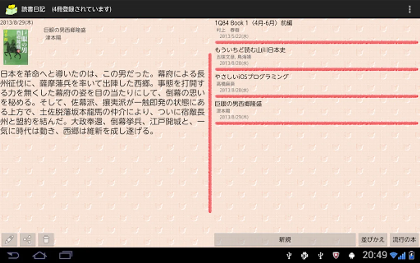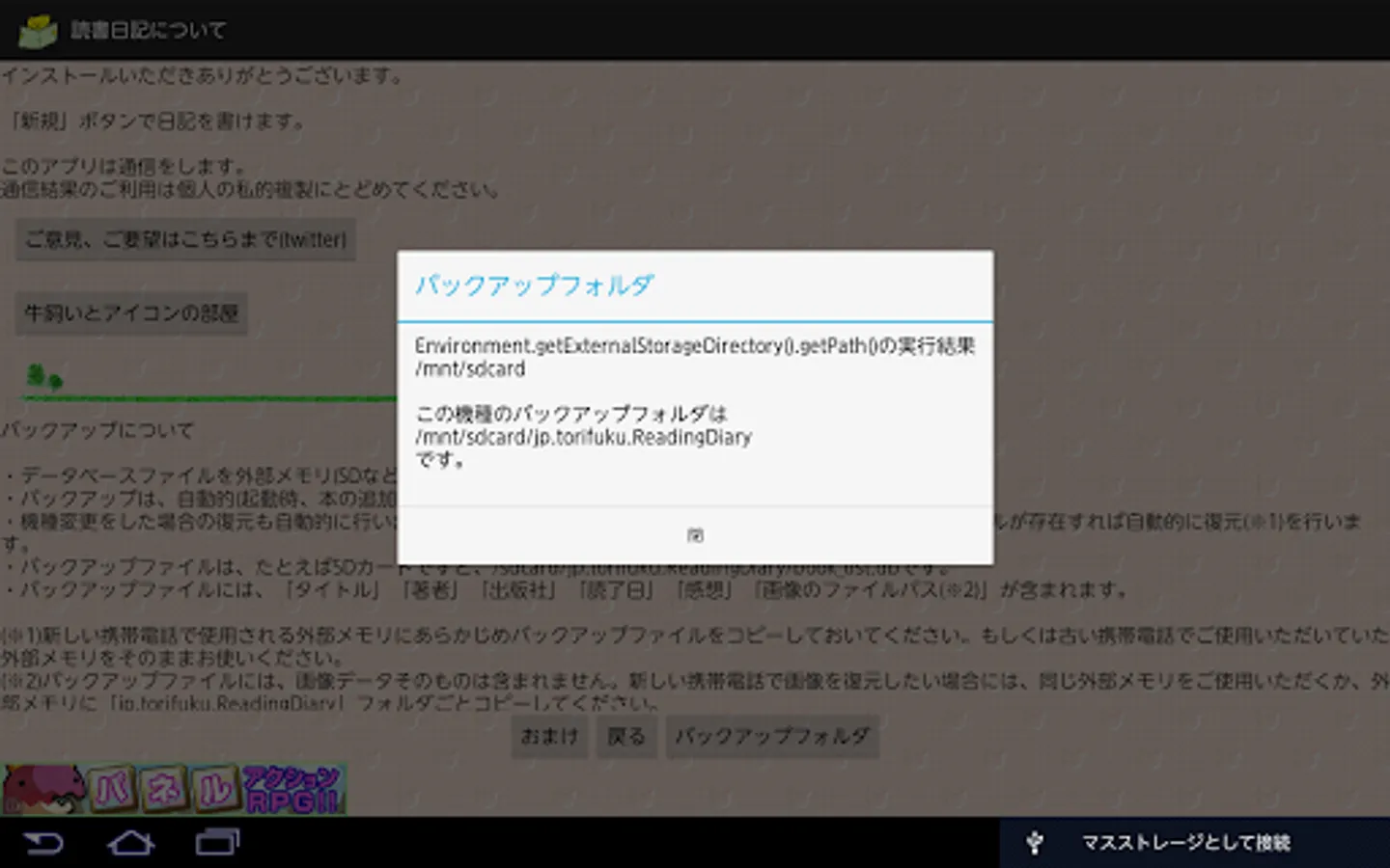• When you use it in the state where you inserted the SD card, it automatically performs (write to the SD card) backup of reading record. You can take the backup file on the SD card, you can use for a long time even after the model change. After starting the app, [menu button] for details -> Please check the [About reading diary].