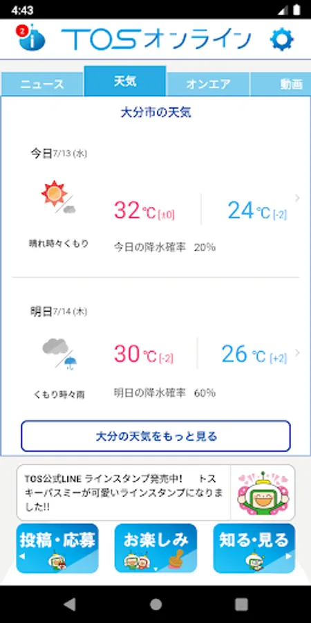 It is a communication app delivered by TOS TV Oita (4ch), a terrestrial TV station in Oita prefecture.