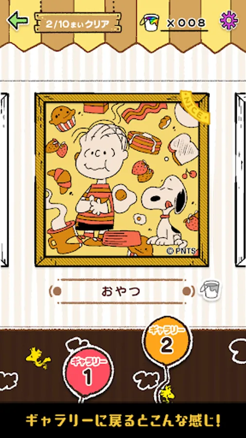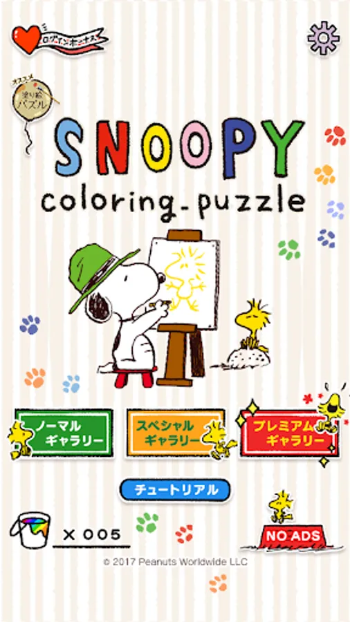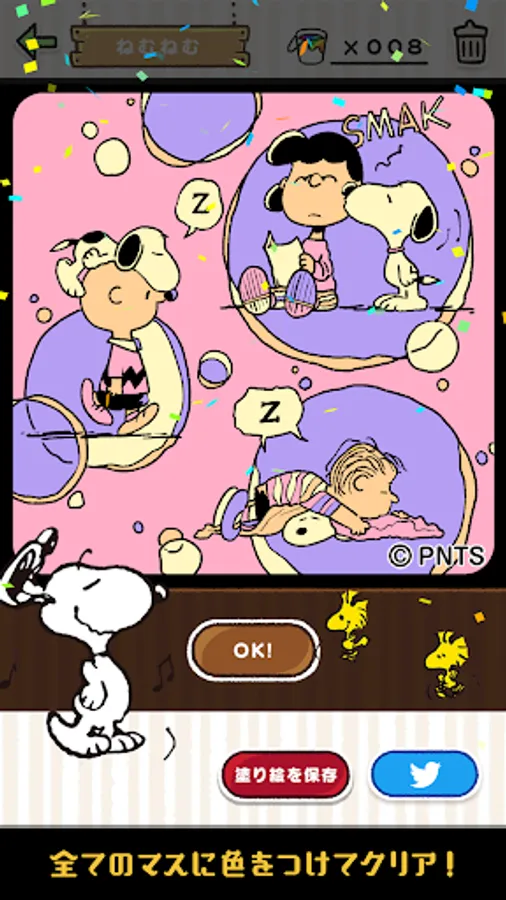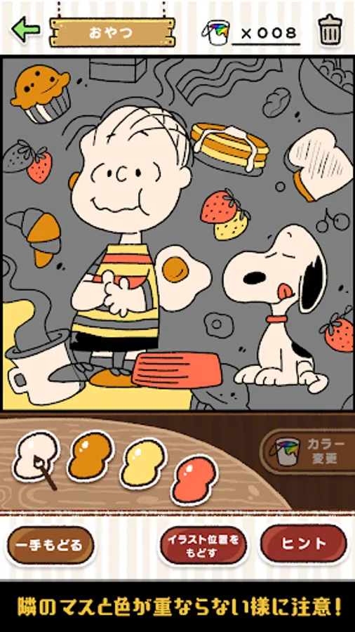 You can enjoy coloring like art of cute Snoopy and PEANUTS friends just by painting the same color in a row.