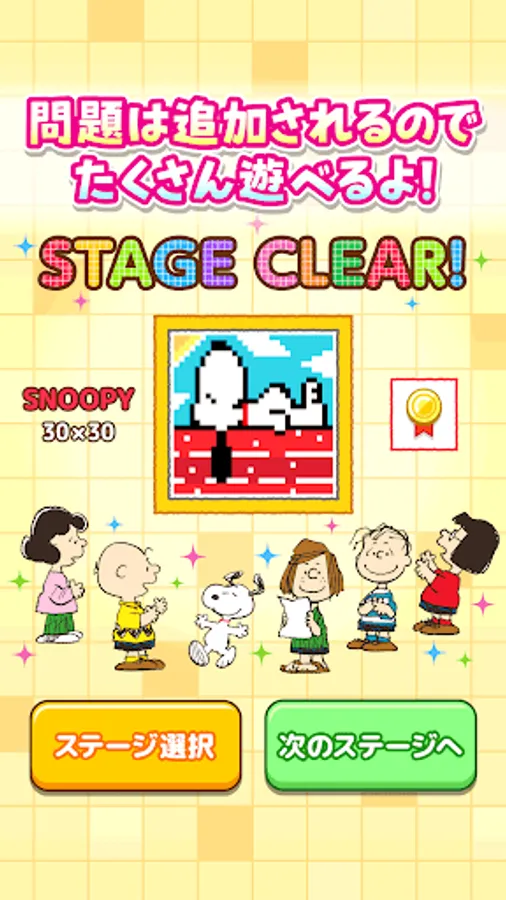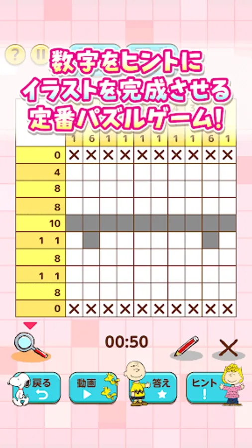 スヌーピーと仲間たちの可愛いイラストのステージが満載の「お絵かきパズル」が登場。数字を読み解いてマス目を塗りつぶしていくと、スヌーピーたちの可愛い絵が現れるよ。