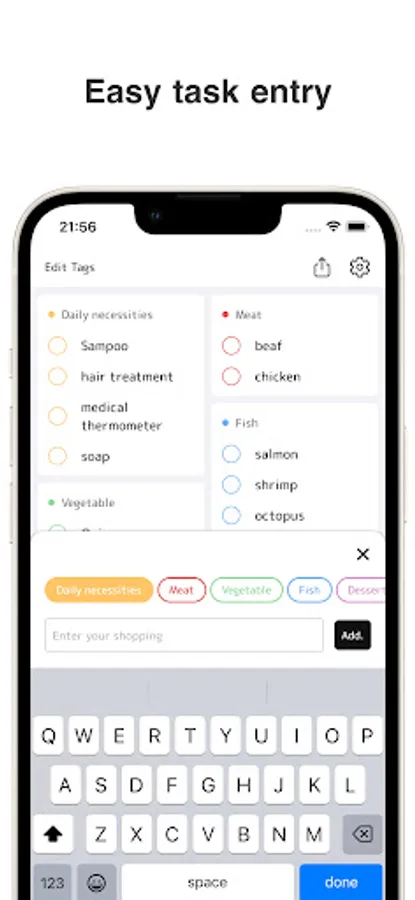 Organize your shopping list by tags and see everything you need on one screen without missing a thing! Plus, with the predictive word function, adding items you've bought before is a breeze.