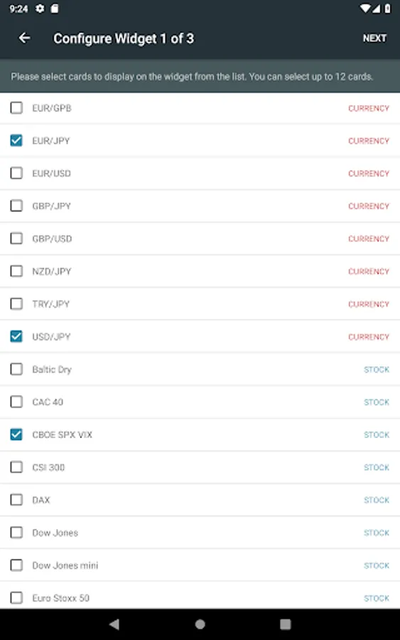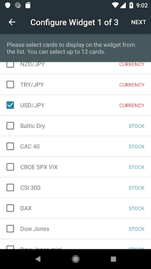 "Configure Widget" screen is displayed. Select the ticker to retrieve and tap "Next" to proceed with the wizard.
