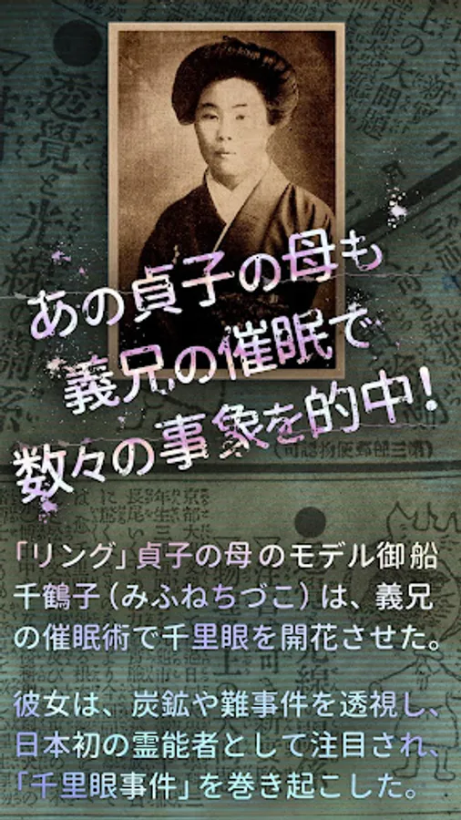 ホラー映画「リング」貞子の母のモデル御舟千津子(みふねちづこ)も、催眠術によって日本初の霊能者に――