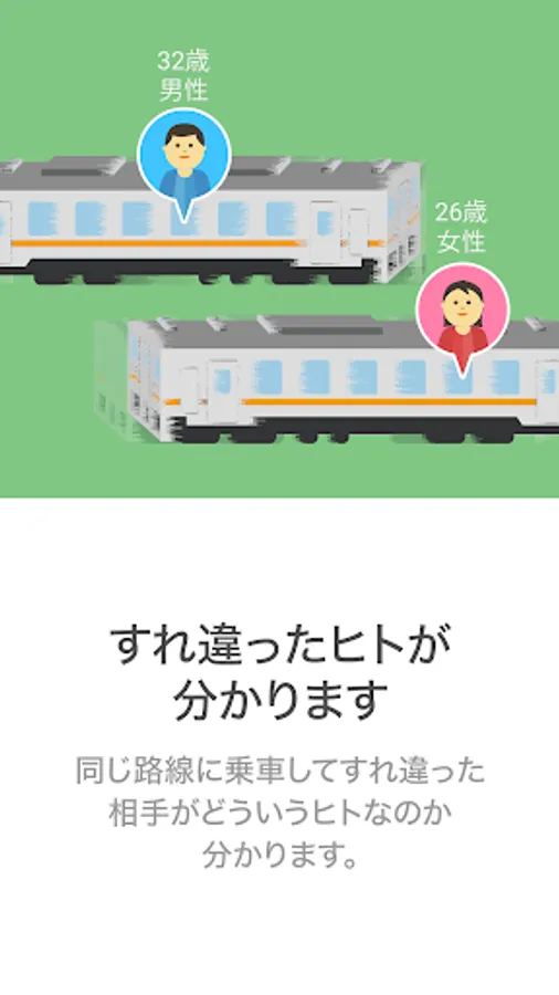 「めぐトロ」は乗っている電車を少し楽しくします。あなたは普段どんな人とすれ違っているでしょう?「20代女性」「30代男性」と「時速100km」ですれ違ったなど、反対方向の電車に乗っていてすれ違った人達の情報が「めぐトロ」に届きます。あなたが今まで知らなかった身近な情報を収集しましょう!