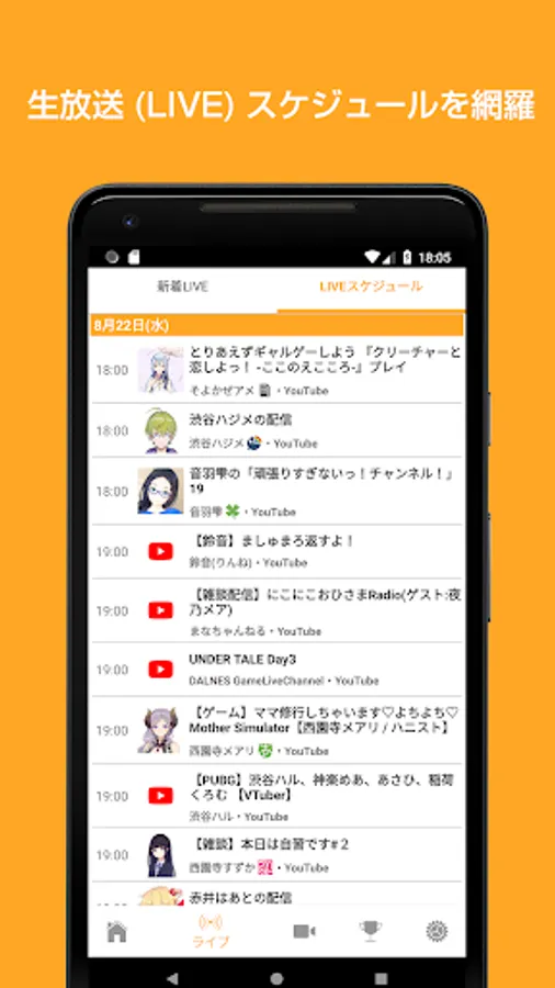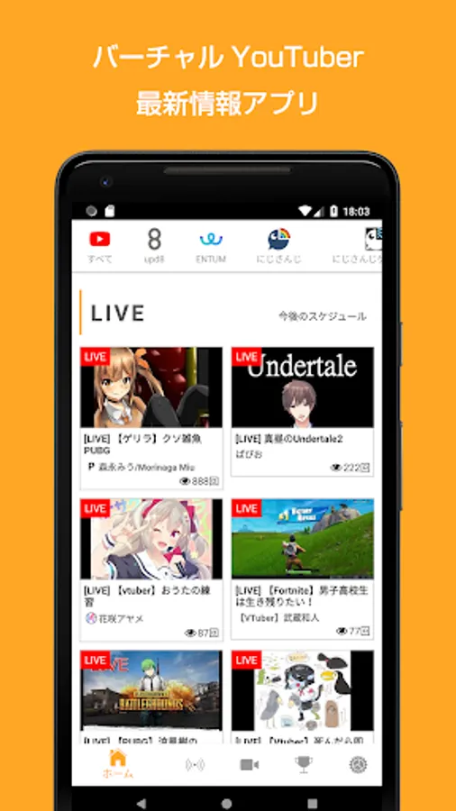 キズナアイや輝夜月といった大人気バーチャルユーチューバー、「にじさんじ」などの人気事務所のライブ情報や人気動画を網羅したアプリです。