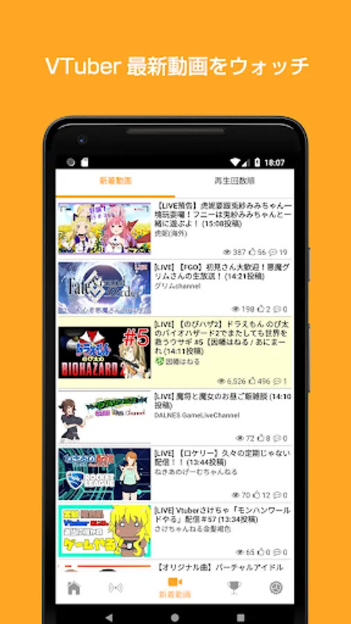 新着動画画面は、新着順に動画を表示しており、最新VTuber動画をいつでも確認できます。人気の動画には黄色の背景色が、もっと人気の動画にはピンク色の背景色でわかりやすくなっています。
