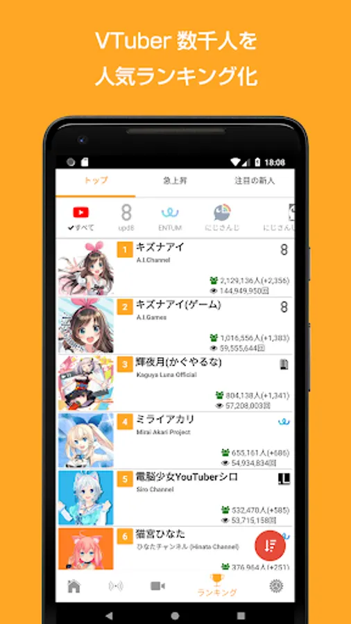 ランキング画面は、ファン数や再生回数でソート可能。新人バーチャルYouTuberだけにしぼったランキングも。また、事務所別に絞り込んだランキングをチェックできます。