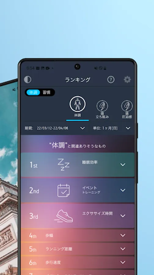 Health data and life logs recorded for a long time in a smartphone. You'd have been developed to harness these data so that you can increase your wellness time. For example, if you have data such as activity level, sleep, blood pressure, and weight, you can check your physical condition, such as when you can sleep well, when your blood pressure and weight go up, etc. It will show you in the ranking what is affecting the. Our goal is to connect data to awareness and to make positive changes for health.