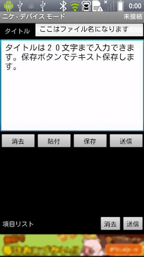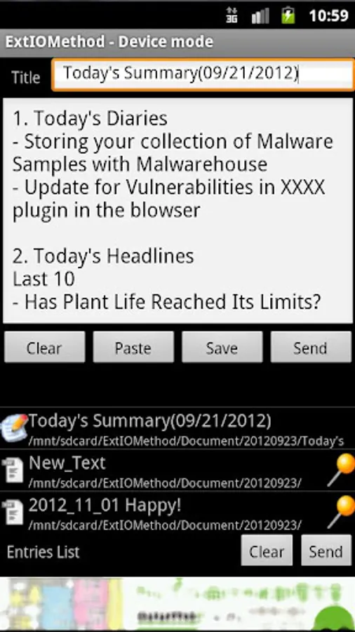 You can type title and contents, and then, save as text data in the SD Card/ExtIOMethod/Document/date-format-folder-name. ToDO, diary/simple memo, and others, it may be your great idea, you can save it without dropping it at the daily work:)