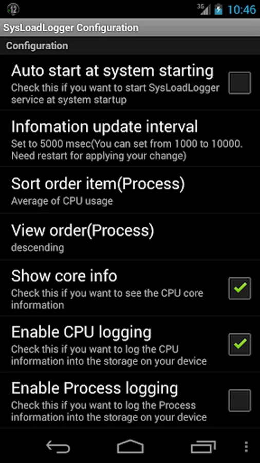 - CPU usage percentage(Total, each core, dual or quad. Refresh per 5 seconds)